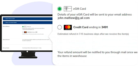 - إذا دفع العميل للطلبية باستخدام طريقة الدفع نقداً عند الاستلام، وبدأ عملية الإرجاع أونلاين، فيُسمح له بتحديد بطاقة الهدايا الإلكترونية كطريقة لاسترداد الأموال.